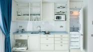 With large windows, natural light floods every corner. White decapé furniture and soft blue upholstery create a fresh and relaxing atmosphere. The kitchen is fully equipped with a 2-burner hob, large sink, undercounter refrigerator, dishwasher, electrical appliances, and kitchenware.